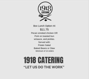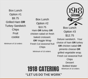 Cream Cheese Pound Cake – Pecan Pie- Apple Cobbler- Peach Cobbler – Brownies – Lemon Cake – Cinnamon Cake – Pineapple Sour Crème Cake – Crème Cheese Cupcakes – Chocolate Crème Cheese Cupcakes- Sweet Potato Pie – Bread Pudding – Assorted Cookies – Southern Lemonade – Sweet and Unsweetened Tea – Fruit Infused Water – 1918 Punch (can be made in a variety of colors) – Bottled Sodas